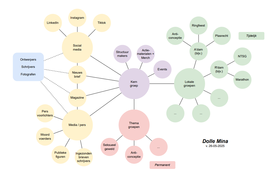 Vanaf begin dit jaar is de Dolle Mina beweging keihard gegroeid! Hieronder zie je welke groepen er inmiddels allemaal zijn en hoe alle verschillende groepen met elkaar zijn verbonden. Lekker overzichtelijk!