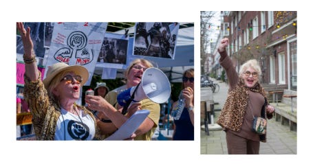 Dunya Verwey (79) is een van de oprichters van Dolle Mina, die werd bedacht in de auto. Ze is Dolle Mina van het eerste uur en was betrokken bij een heleboel acties. Tijdens die acties raakte ze bevriend met Claudette en sindsdien zijn ze hele goede vriendinnen. Ook nu strijdt Dunya onvermoeibaar; ze sjeest met haar auto door het land en is bijna bij elke actie geweest.